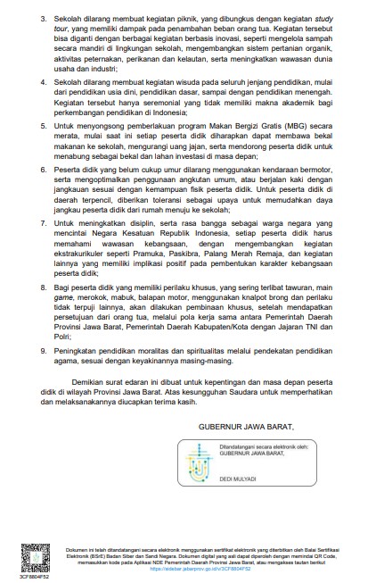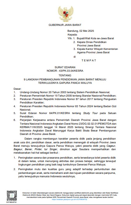 Pada tanggal 2 Mei 2025 bertepatan dengan Hari Pendidikan Nasional, Gubernur Jawa Barat mengirimkan Surat Edaran dengan No. : 43/PK.03.04/KESRA tentang 9 LANGKAH PEMBANGUNAN PENDIDIKAN JAWA BARAT MENUJU TERWUJUDNYA GAPURA PANCA WALUYA. Isi surat tersebut adalah sebagai berikut :